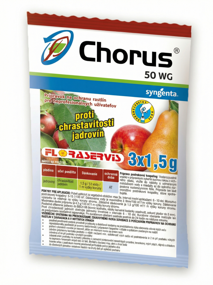 CHORUS 50 WG je účinný systémový fungicíd určený na ochranu ovocných stromov a viniča proti hubovým chorobám, najmä v skorých fázach vegetácie. Vďaka systémovému pôsobeniu preniká do pletív rastlín a poskytuje spoľahlivú ochranu aj pri nižších teplotách.