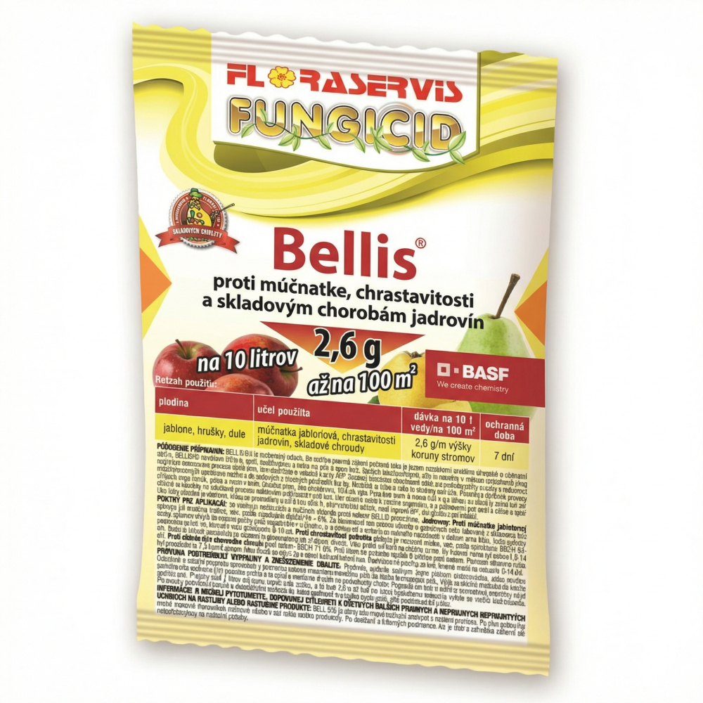 Floraservis Bellis 2,6 g je vysoko efektívny fungicíd, ktorý účinne bojuje proti múčnatke, plesni a iným hubovým chorobám vyskytujúcim sa na ovocných stromoch a zelenine. Obsahuje dve účinné látky – boskalid a pyraklostrobín, ktoré zabezpečujú dlhodobú ochranu a rýchly nástup účinku.
