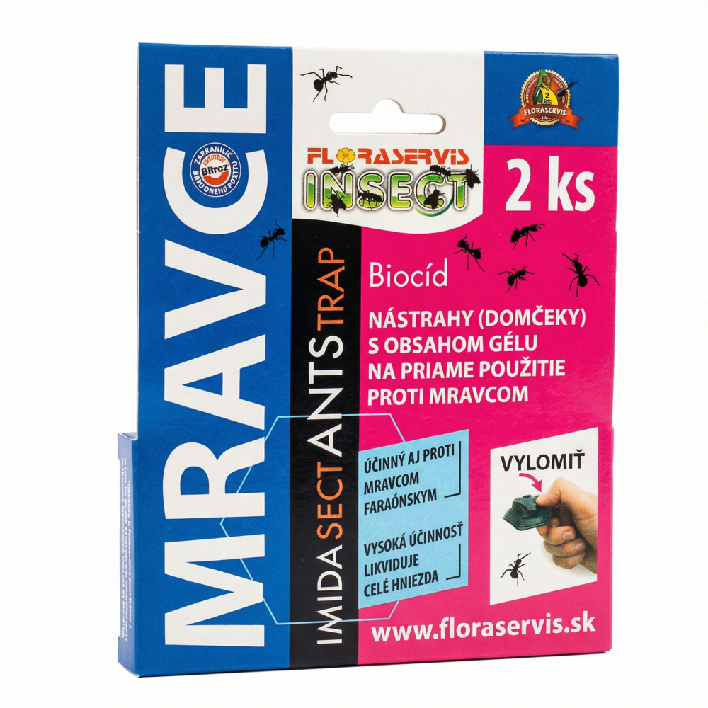 Imidasect Ants Trap od značky Floraservis je spoľahlivým riešením proti nežiaducemu výskytu mravcov v domácnosti, na terasách, balkónoch či v okolí budov. Nástraha obsahuje atraktívnu požerovú zložku, ktorú mravce odnášajú do hniezda, čím dochádza k postupnej likvidácii celej kolónie vrátane kráľovnej.