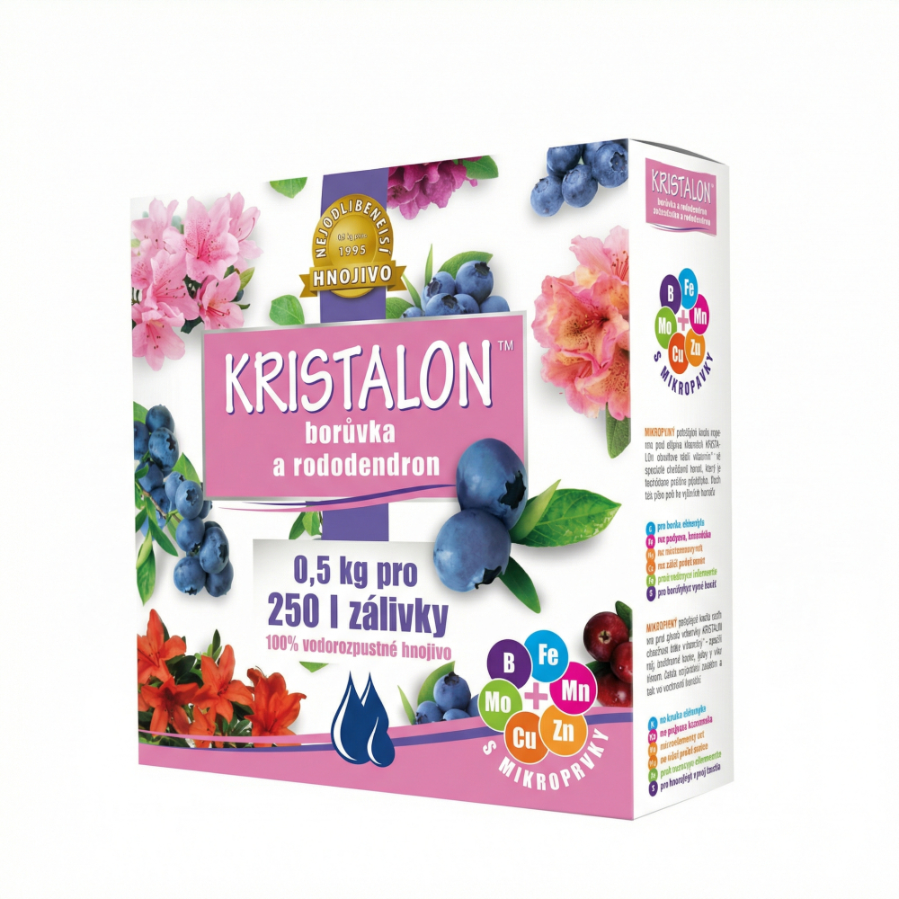 KRISTALON Rododendron a čučoriedky 500 g je špeciálne vyvinuté minerálne hnojivo s vyváženým obsahom živín a mikroprvkov, prispôsobené potrebám kyslomilných rastlín. Podporuje silný koreňový systém, intenzívne vyfarbenie listov a bohaté kvitnutie.