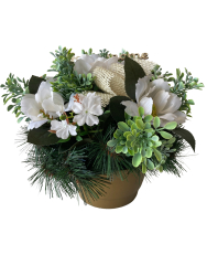 Aranžmán je umiestnený v miske so záťažou, ktorá zaisťuje stabilitu a odolnosť voči vetru či dažďu, a preto je vhodný na celoročné použitie.