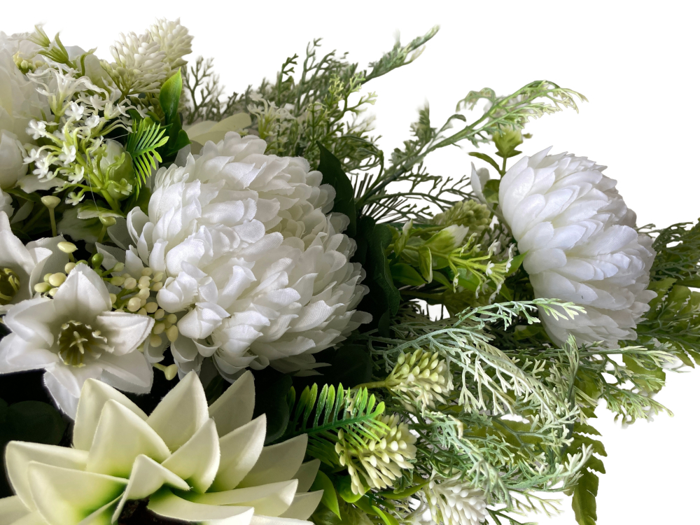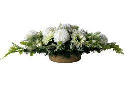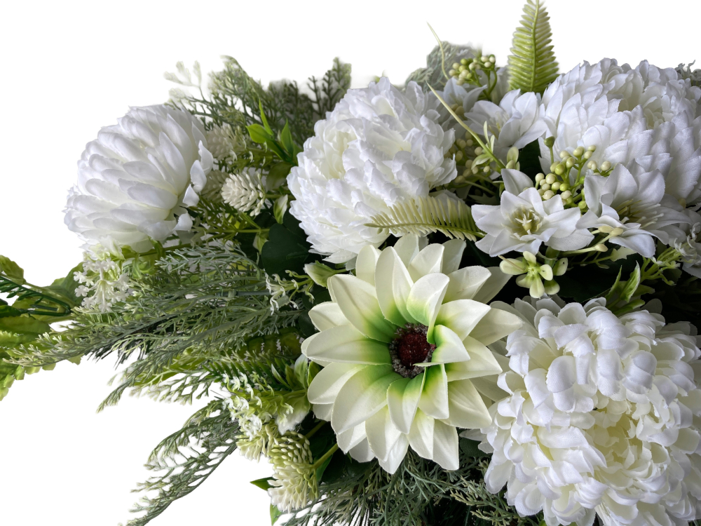 - Náhrobná ikebana biela chryzantéma a dália v lodičke