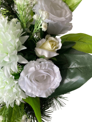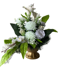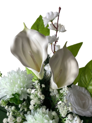 - Náhrobná ikebana biela kália, chryzantéma a ruža v miske na nohe