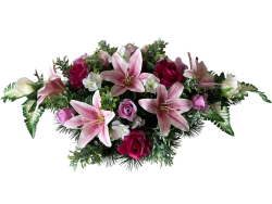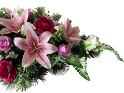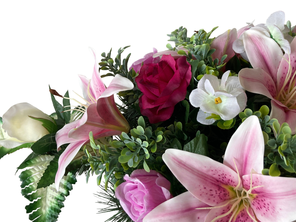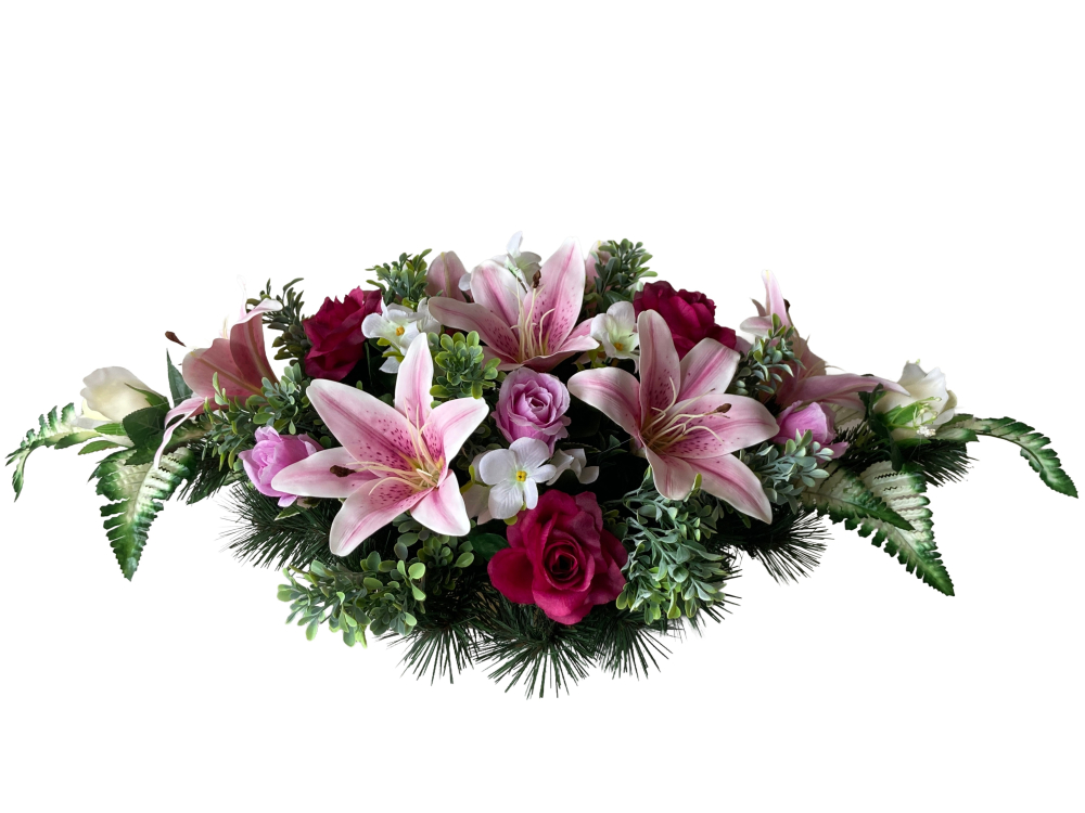 Táto náhrobná ikebana spája eleganciu bielej ľalie – symbolu čistoty a večnosti – s výraznou cyklámenovou ružou, ktorá predstavuje lásku a úctu k zosnulým.