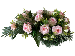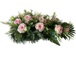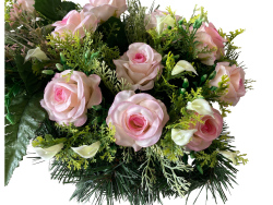 Táto náhrobná ikebana v tvare slzy je vyrobená s citom pre detail a úctu k zosnulým. Dekorácia je zdobená ružovými mini ružami, ktoré pôsobia nežne a elegantne. Umiestnené sú v misku so záťažou, ktorá zabezpečí stabilitu aj pri silnejšom vetre.