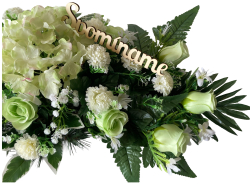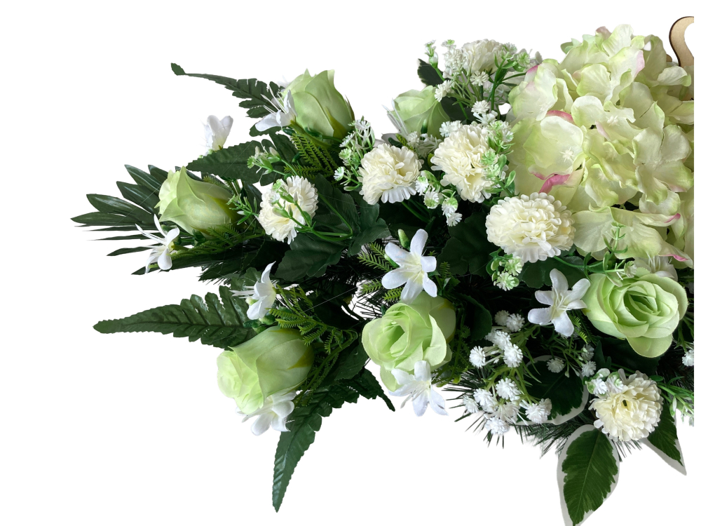 Táto elegantná náhrobná ikebana je vyhotovená v tvare lodičky a zdobená kombináciou zelených ruží a mini klinčekov. Jemná farebná harmónia pôsobí prirodzene a dôstojne, pričom dekorácia vynikne na každom hrobe.