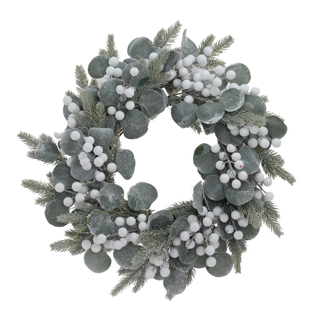 - Veniec čečina, eukalyptus, biele bobule, zasnežený – 53 cm